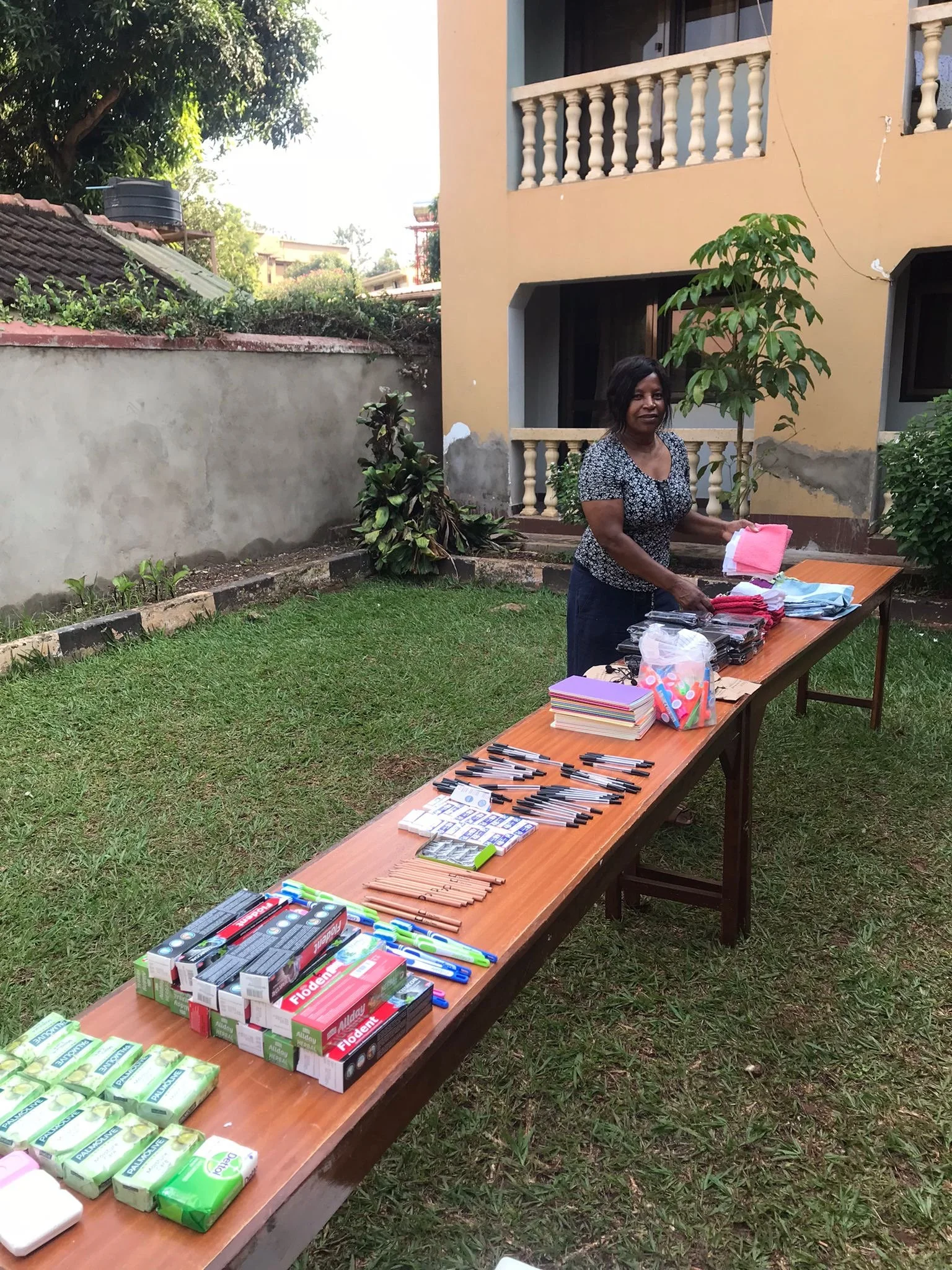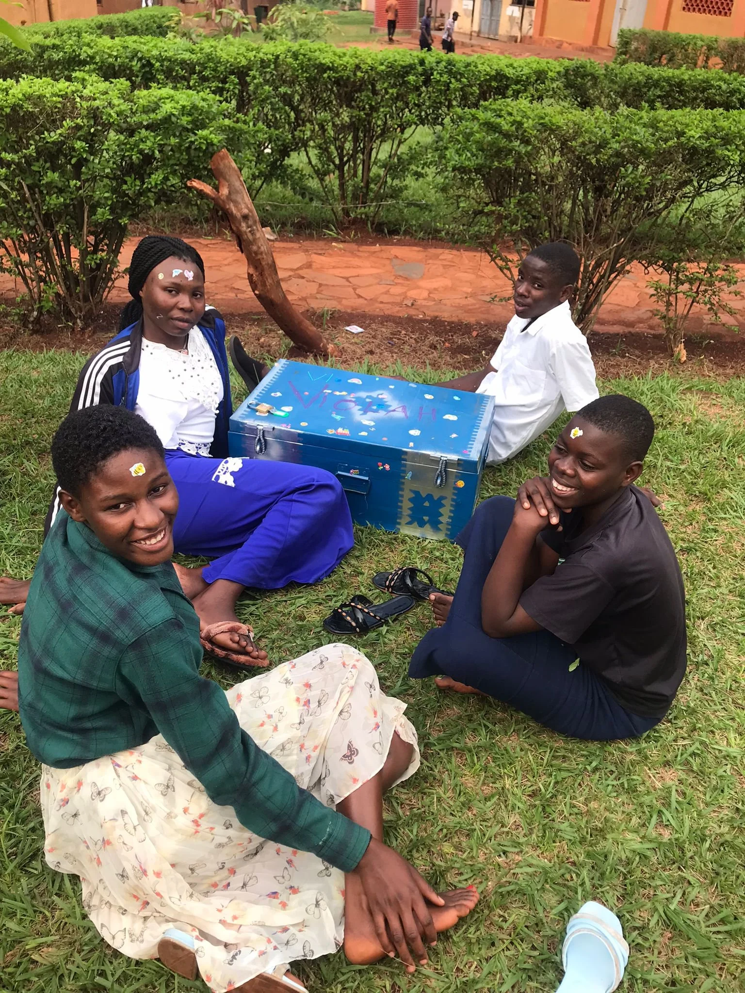 /The day started with devotions at the bottom garden, it was a bit dull to start with but by the time we had finished breakfast it was the start of a lovely sunny morning. We adjourned to the top garden to prepare gift bags for the 20 new students. We met up with them later in the afternoon. We also made up 35 bags for the girls who'll be living in the newly decorated dorm. We got to NVI at 1.30 pm and laid out all the gifts and metal trunks. We met all the UgandAid and Steve spoke to them all about what we’ve expected of them while they’re studying at NVI. After the second and third years had gone back to their afternoon lessons, we then proceeded to the mango tree to talk with the first year. They’re all a lovely bunch of students willing to learn, to make a better life for themselves. Some of them are very shy but who ain’t when you’re moving into somewhere out of your comfort zone, they were all very pleased with what they were given, they began to decorate their trunks and flasks and mugs.